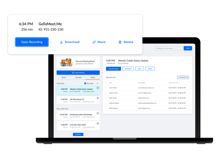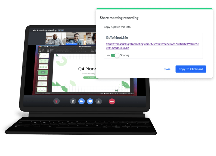 GoTo Meeting zeichnet Ihre Meetings für Sie auf. Sie können Ihre aufgezeichneten Meetings und Transkripte ganz einfach durchsuchen und mit anderen teilen. -